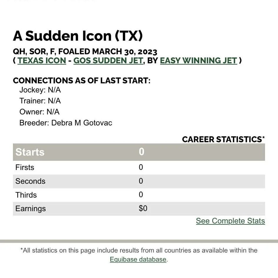 Sired by Texas Icon, she carries proven speed influence, while Gos Sudden Jet adds additional performance power on the bottom side. This cross is built for acceleration, rate, and the kind of natural turn that stands out when the stakes get high.