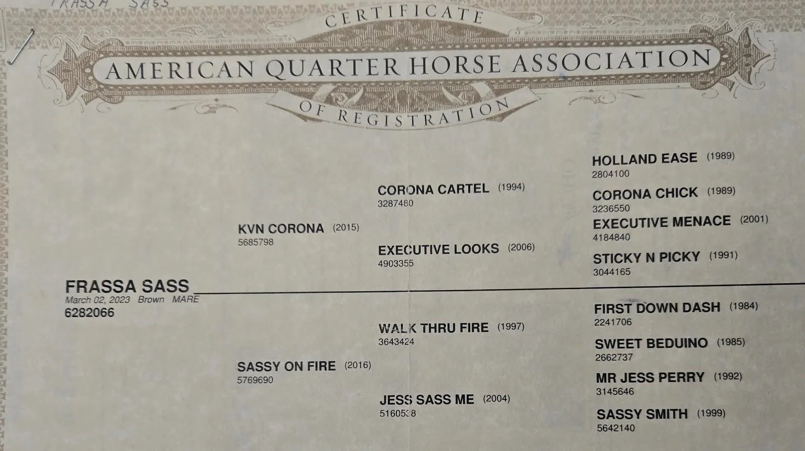 Frassa Sass (UT) is a powerful young prospect bred for speed, athleticism, and competitive edge. This 2023 filly combines proven race genetics with a strong maternal performance foundation — the kind of cross serious futurity programs look for.